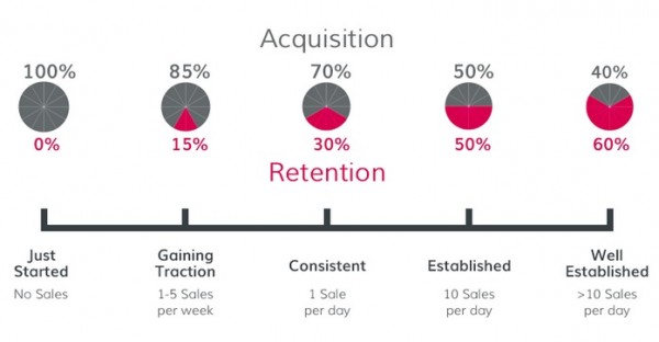 在了解了顾客获取和留存各自的重要性,我们可以开始研究要怎么分配预算。我们必须让这件事同时进行,会变动的只有分配在上面的金额。你的分配策略应该或由两个因素主导:商店的生命周期和产品的定位。