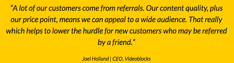 制作一支原生影片所使用到的素材可能会非常昂贵,但是Video Block 颠覆了业界的常规,它提供影片素材,从短片、背景、特殊效果、甚至到AfterEffects 范本等,不论每个月下载多少内容,都均一收费,但现在Referral Program 并没有直接在网站上揭露。不过根据 Video Block 的 CEO 的引言,推荐营销的策略的确让他们更不费力地招来更多许多新客户,而 Refferral Candy 的个案研究也显示出 Video Blocks 透过推荐营销赚进 10 万美元。