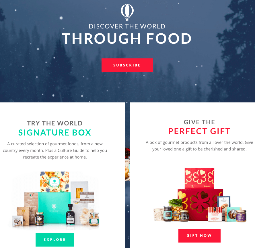 Try the World 创办的概念有点类似于此。创办人因为喜欢旅行和美食,对于在异国尝到的料理常常难以忘怀,便想要在自己的家里重现他们在旅行时的当地最喜欢的菜,然而碍于异国食材在美国取得不易,于是他们便创办了Try the World,让人们可以透过在家里订购他们为你配置好的异国料理发现盒,环游世界的饮食文化。