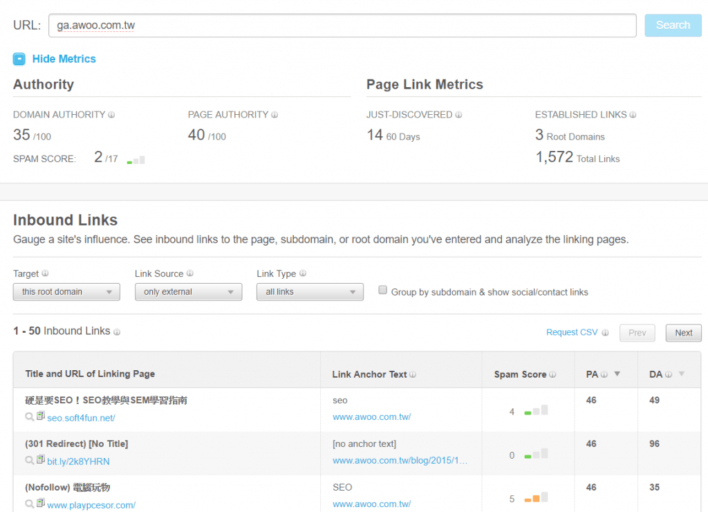 用OpenSiteExplorer 你只要输入对手的网址,它的外链清单就可以一览无遗,从这个清单中你可以看到对手的PR 策略、媒体经营策略、他们是否有投稿到哪些媒体、有在哪些论坛露出、有跟哪些博客合作.. 等资讯你都可以得到。