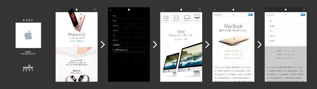 Apple选单使用跳页方式呈现,在选择产品大分类后,进入该类别的专页,不使用相同的选单样式,而选择使用横式滑块,并使用分类图做搭配,在第三层产品介绍项目页面中,使用第二阶层下拉选单。他将每一层做区分,并针对每一层的不同需求,而对应不同的选择方式。