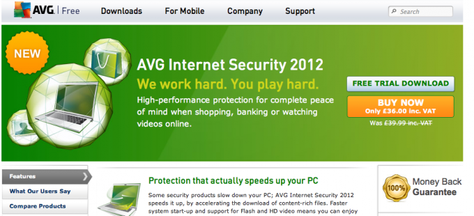 网页上有多个不同用途的按钮时,例如「立即购买」、「下载试用版」等,可以依按钮重要性来设计,以突显主要与次要的按钮。例如 AVG 使用亮橘色呈现最重要的「立即购买」钮,跟其他按钮做区隔(下图)。消费者不仅能一眼就看到,还能持续保持注意力。